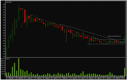 Prediksi Saham 19-23 Desember 2011Nusantara Infrastruktur. Tbk (META) telah berhasil menembus garis downtrend-nya di sertai dengan volume yang besar yang menandakan adanya perubahan trend yang cukup signifikan pada saham ini.